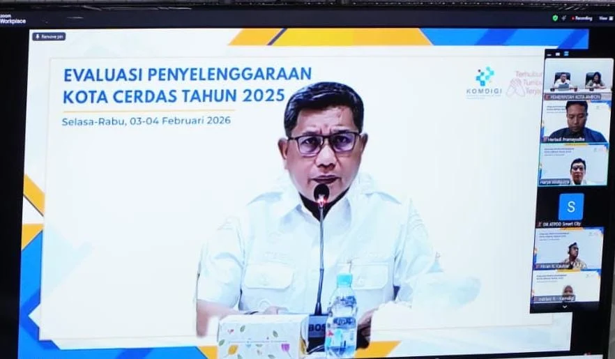SUARATAHURI.COM – Ambon,Dalam sambutan arahannya, pada kegiatan Evaluasi Implementasi Kota Cerdas (Smart City) Tahun 2025, Selasa (4/2/26) secara Virtual, di Ruang Vlissingen – Balai Kota, Wali Kota Ambon, Bodewin M. Watimena, menyampaikan terima kasih kepada pemerintah pusat melalui Kementerian Komunikasi Digital (Komdigi) RI dan kementerian/lembaga lainnya terkait kesempatan bagi kota Ambon menjadi bagian dari evaluasi implementasi Smart City di Indonesia.